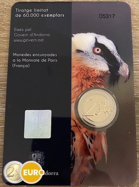 La pièce présente un portrait détaillé de la tête du gypaète barbu, regardant vers la droite. Le fond uni souligne l’expression imposante. Sous l’image se trouvent le nom du pays, « ANDORRE », et l’année « 2025 », le tout encadré par l’anneau argenté avec les douze étoiles de l’Union européenne.