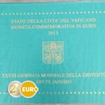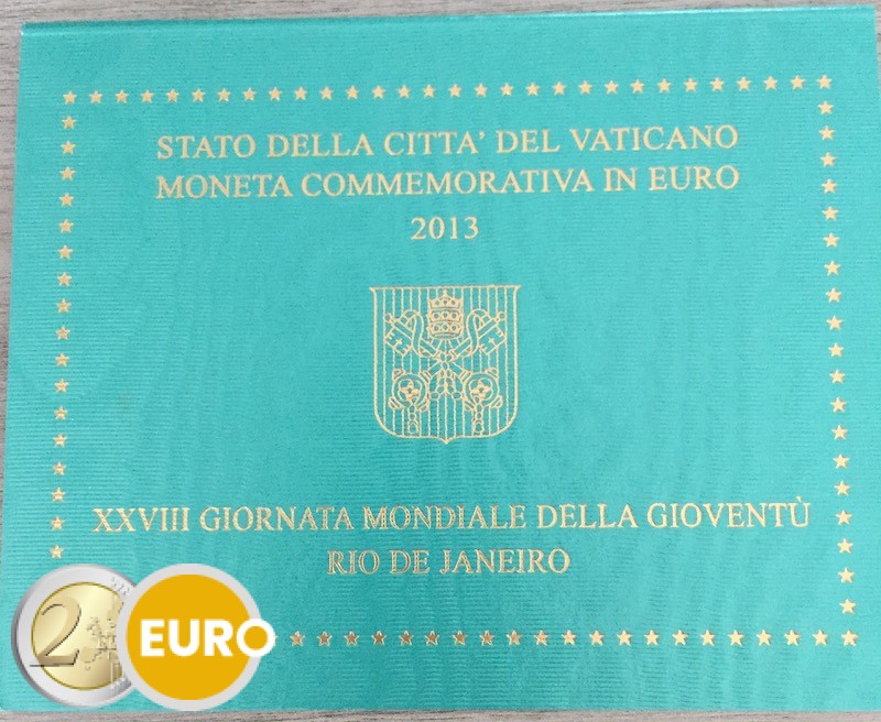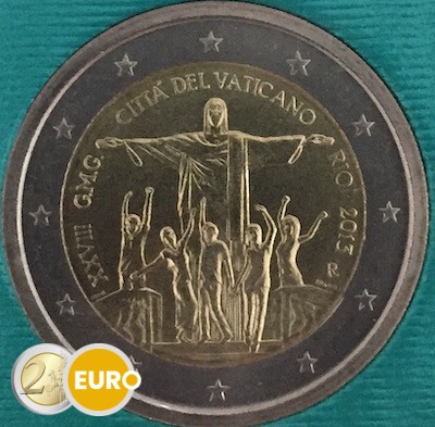 Au milieu de la pièce, il y a l’image du Christe sur le mont Corcovado. Il y a des enfants sur les escaliers avant. De gauche à droite, on peut retrouver le texte “XXVII GMG CITTA DEL VATICANO RIO 2013”. également à droit, il y a le lettre R pour la monnaie à Rome et le nom du créateur de l’image, Patrizio Daniele