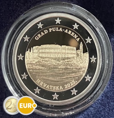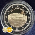 Cette pièce de 2 euros commémorative rend hommage à l’Amphithéâtre de Pula, l’une des arènes romaines les mieux préservées au monde. Ce monument impressionnant du Ier siècle symbolise le riche patrimoine et l’histoire de la Croatie.