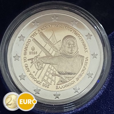 Cette pièce de 2 euros commémorative rend hommage au 200e anniversaire de la mort de Laskarina Bouboulina, héroïne grecque de la guerre d’indépendance. En tant qu’amirale et stratège courageuse, elle a joué un rôle clé dans la lutte contre l’Empire ottoman.