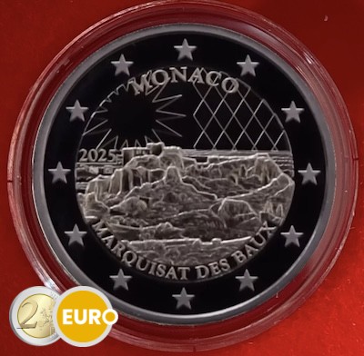 À l’avers figure au centre le célèbre rocher des Baux-de-Provence (Bouches-du-Rhône) dans son état actuel ainsi que les environs du village des Baux-de-Provence. En haut de la pièce figure l’État émetteur « MONACO », accompagné à droite d’un écu échiqueté et à gauche de l’étoile des Baux. En bas apparaissent la légende d’émission « MARQUISAT DES BAUX », l’année d’émission « 2025 » ainsi que les marques monétaires de la Monnaie de Paris et du graveur général Joaquin Jimenez. Sur l’anneau extérieur de la pièce figurent les douze étoiles du drapeau européen.