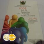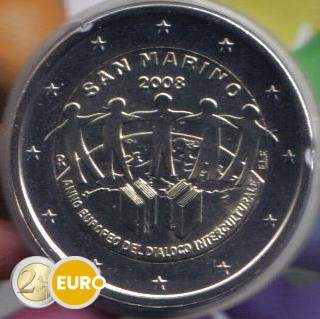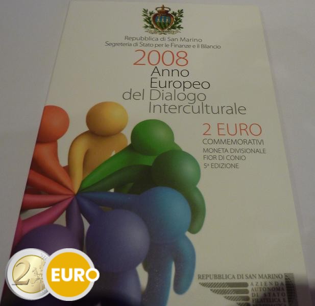 L’inscription « ANNO EUROPEO DEL DIALOGO INTERCULTURALE » figure sous le motif, les mots « SAN MARINO » et l’année d’émission « 2008 » apparaissant au-dessus du dessin. Les initiales « E.L.F. » de l’artiste, Ettore Lorenzo Frapiccini, sont inscrites à droite et la marque d’atelier « R » à gauche. L’anneau externe de la pièce représente les douze étoiles de l’Union européenne.